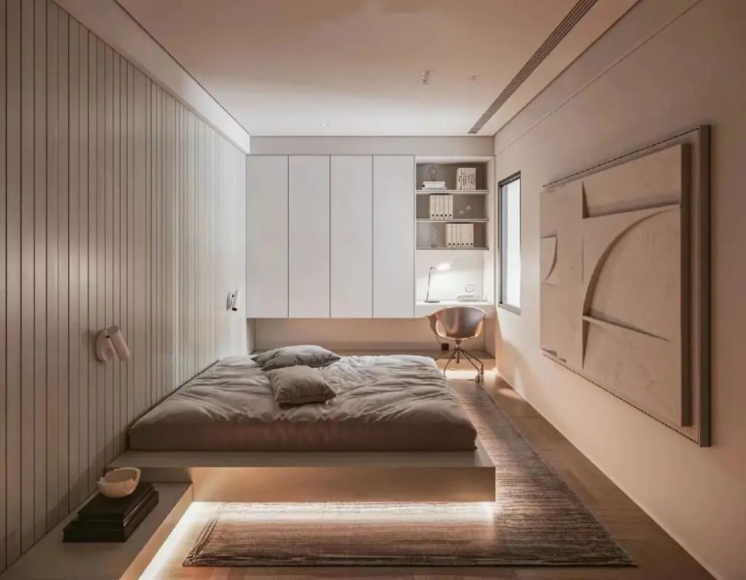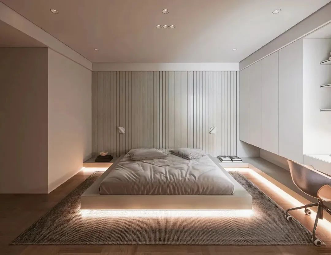 整个房间充满充满了科幻感,靠墙加入轻盈的悬浮地台床。延伸地台变成床头柜+桌下收纳。沿边嵌入发光灯带,床头装置射灯,光线可以随时调整。光影层次绝妙,整体视觉美观、新颖又时尚。