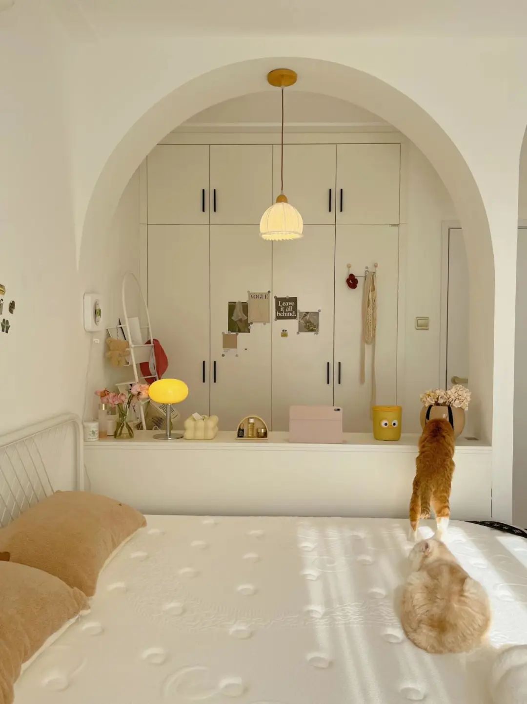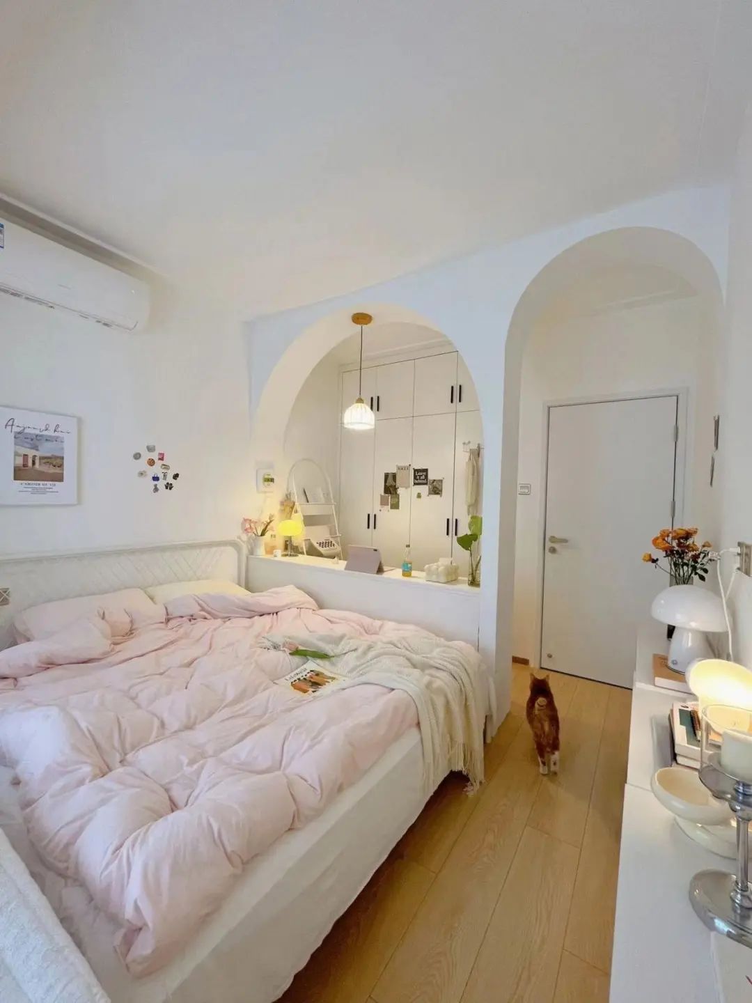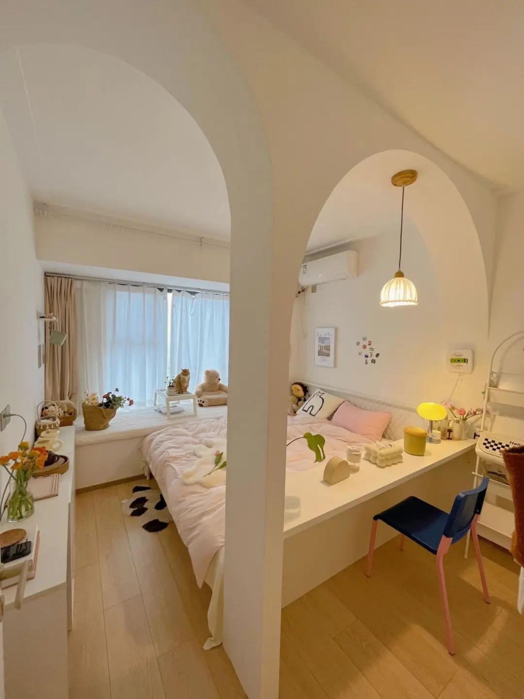 利用拱门设计进行空间分割,布局遵循休闲→睡觉→学习化妆→穿衣动线,全景飘窗+衣帽间细节惊喜满满,轻奢浪漫的氛围感瞬间UP。小卧室创意满分,科学收纳,舒适翻倍,堪称“女神”范儿。