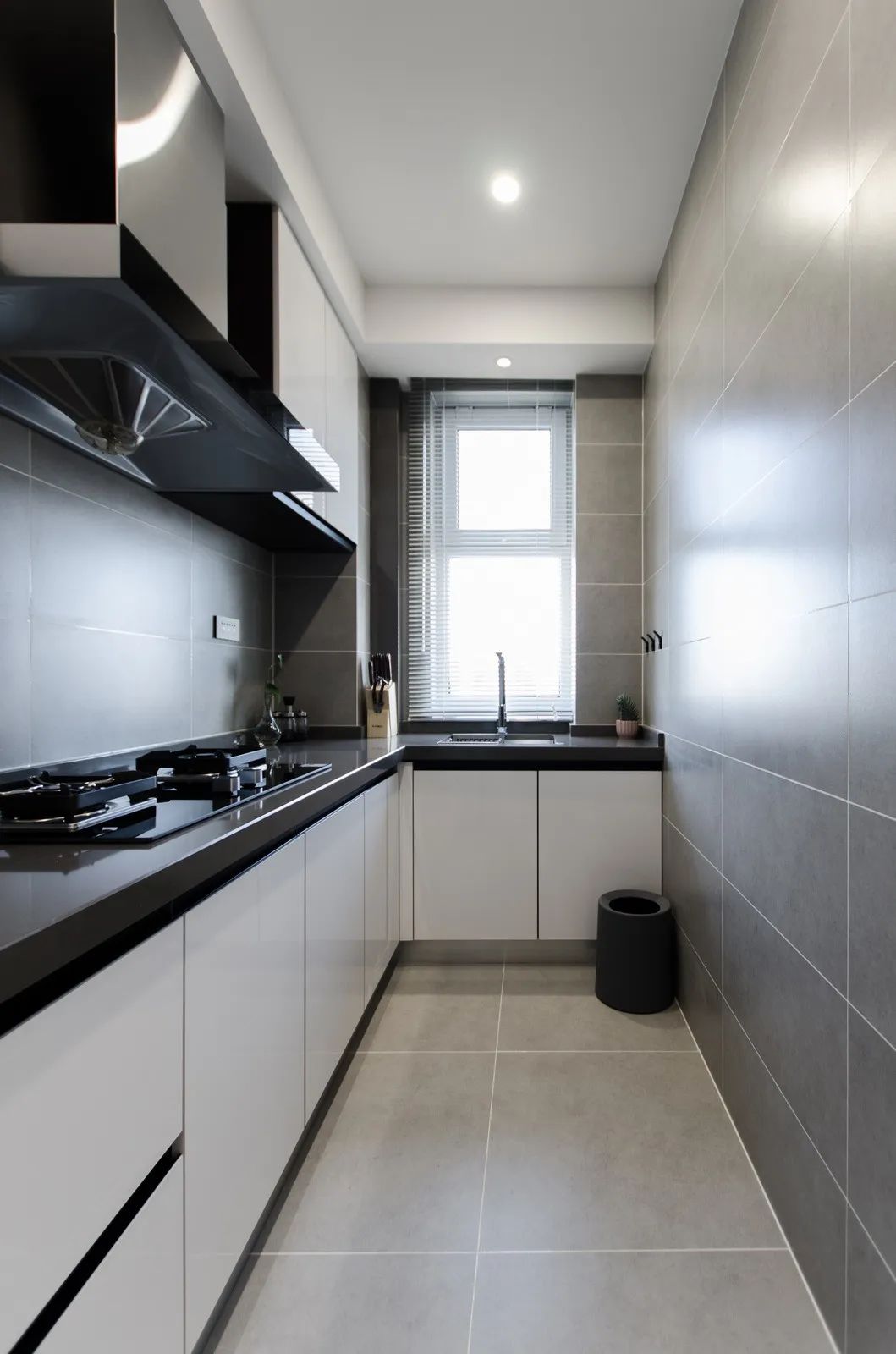 厨房工作靠一面墙布置,空间需求小,工作区组合简单,适合瘦长型厨房。储物区→备餐区→烹制一字排开,一条动线贯穿做饭整个流程。