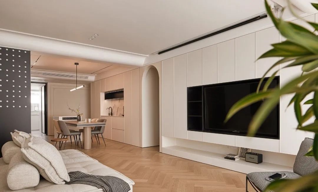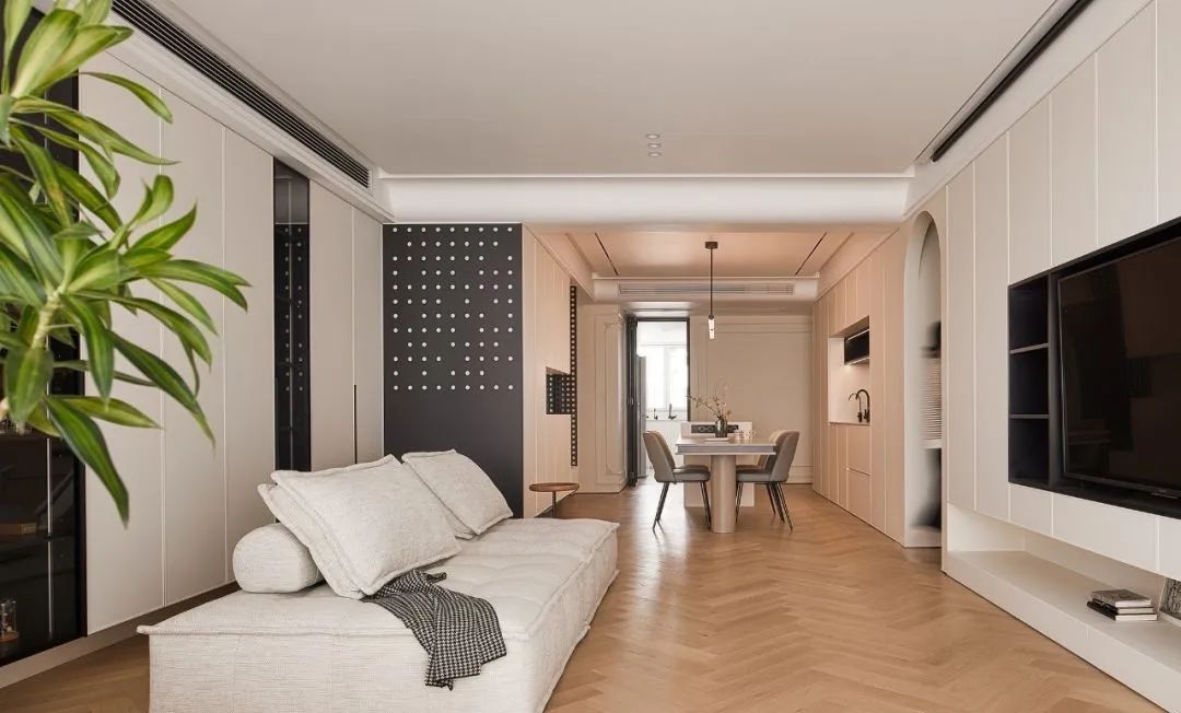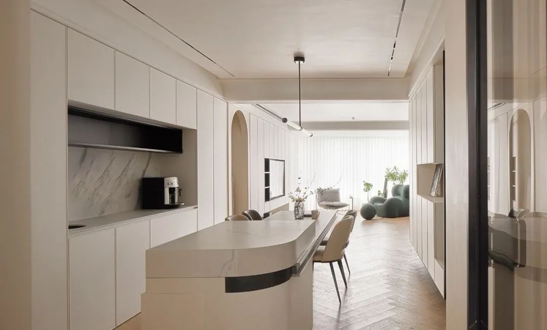 弧形吊顶自然过渡,一扇伪装成柜门的隐形门将家务区和晾晒区隐于客厅以外。