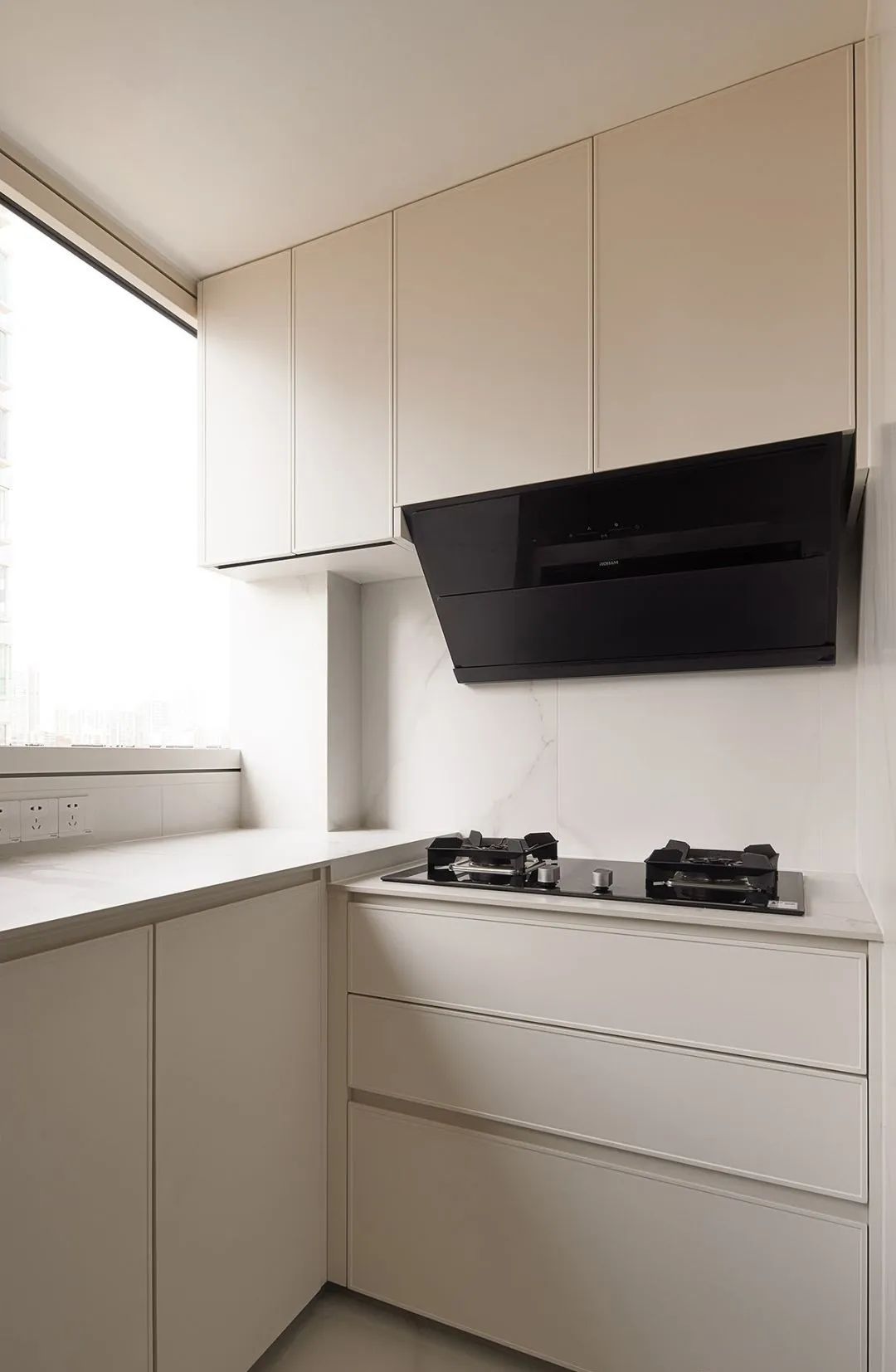 厨房面积不大,不过采光不错,延续了奶酪白的主色调,放大空间。台面细致的做了“错层”处理,方便适应翻炒、切配菜不同的场景需要。