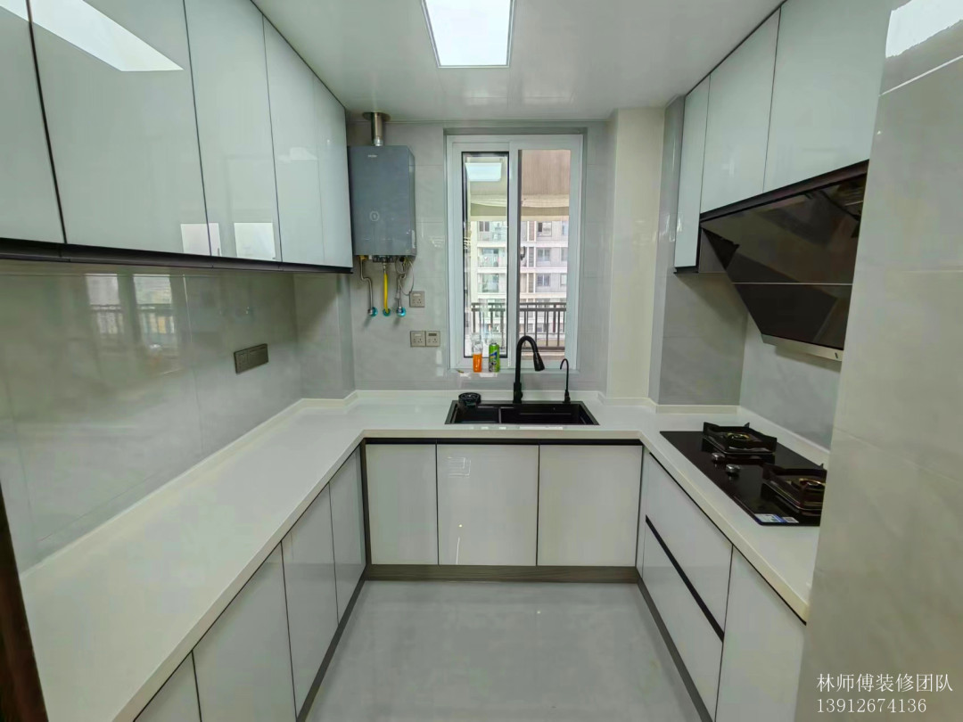 厨房白色为主,干净清爽。u型设计,收纳充足。水池靠窗,采光好。整体动线设计非常合理。