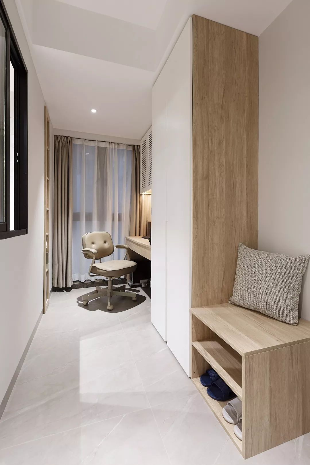 鞋柜被放在了入户门的侧方,原本是个小阳台的格局,被设计师改成了鞋柜加上书桌的设计,让家里多出一个工作区,换鞋凳也整合进了鞋柜里。