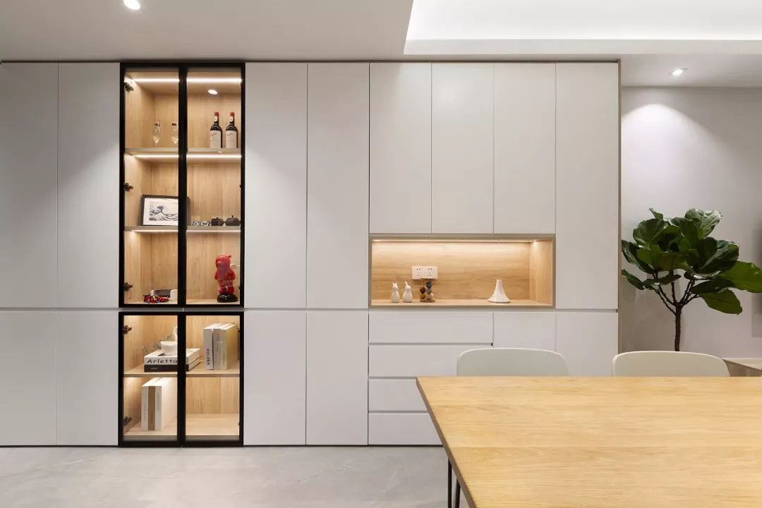 餐厅侧方的餐边柜,非常喜欢的设计,玻璃柜门加上留空的格子内都加入了藏光,搭配白色与木色结合的设计,让人感觉时尚又舒适。