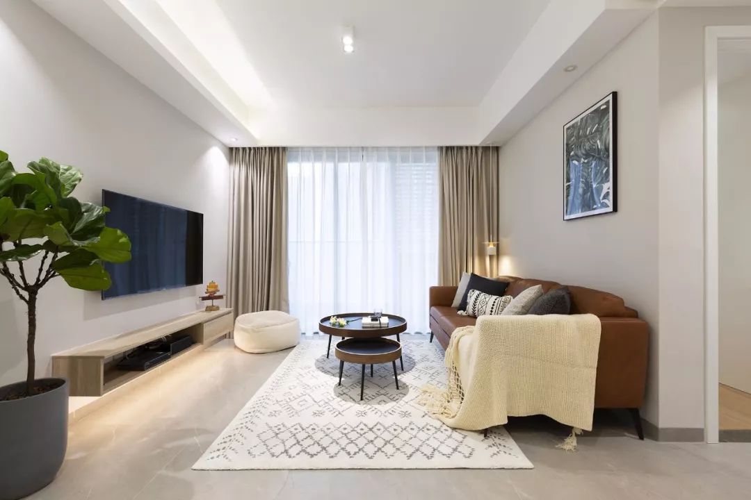 客厅的设计比较简单,墙面是刷成了浅灰色,棕色的皮沙发搭配深色的茶几,让客厅多出了一些现代风的时尚感,电视柜的底部加藏光,也更方便打扫。