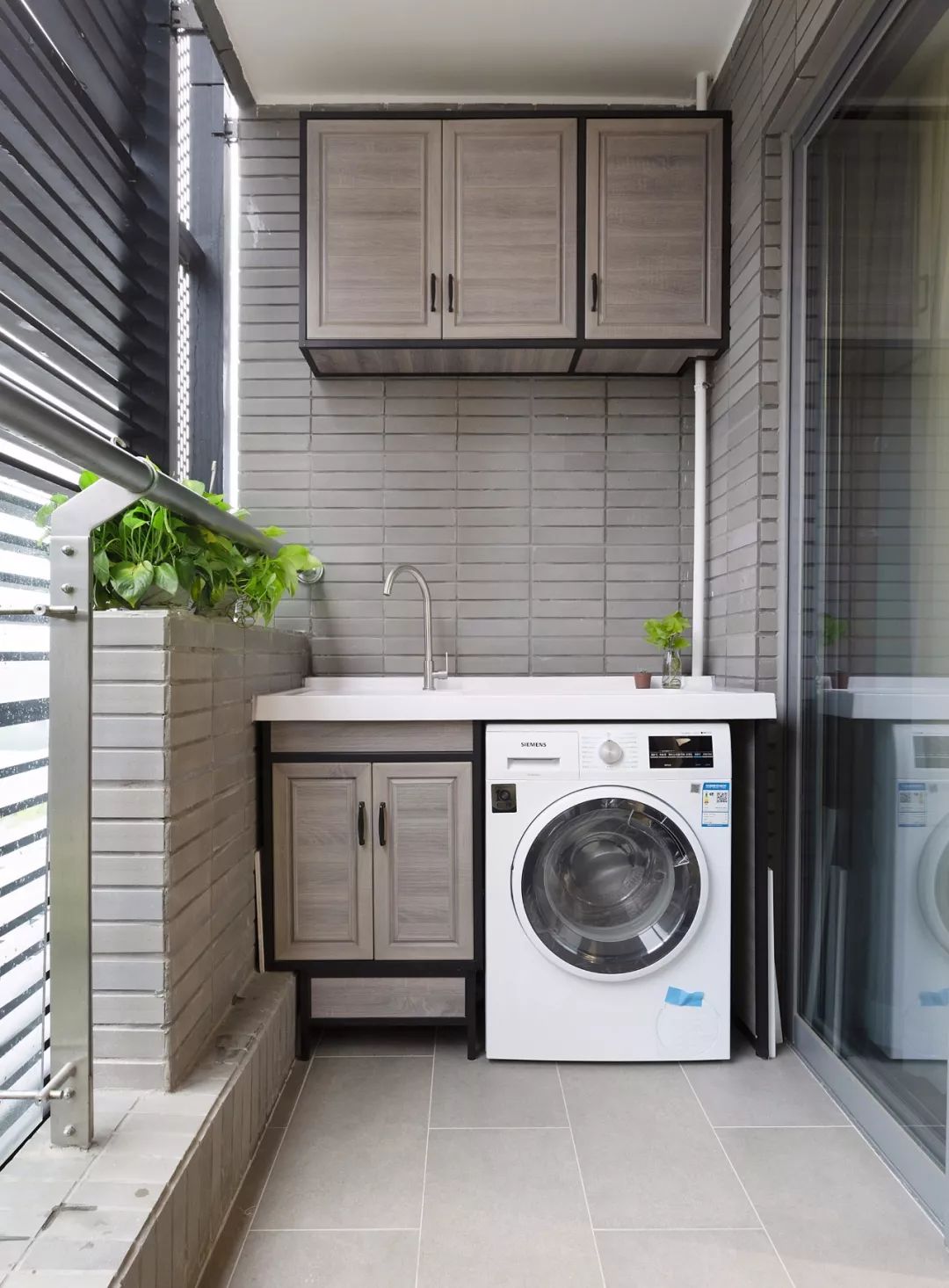 阳台被改成了洗衣房,在阳台的一侧做上洗衣机、洗衣台和吊柜,灰色质感的瓷砖和灰木色的柜子,让人感觉非常时尚。