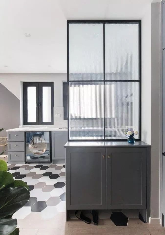 在入户与室内公共空间之间加一个玄关柜做隔断,既可以分割空间,又可以实现良好的玄关功能。