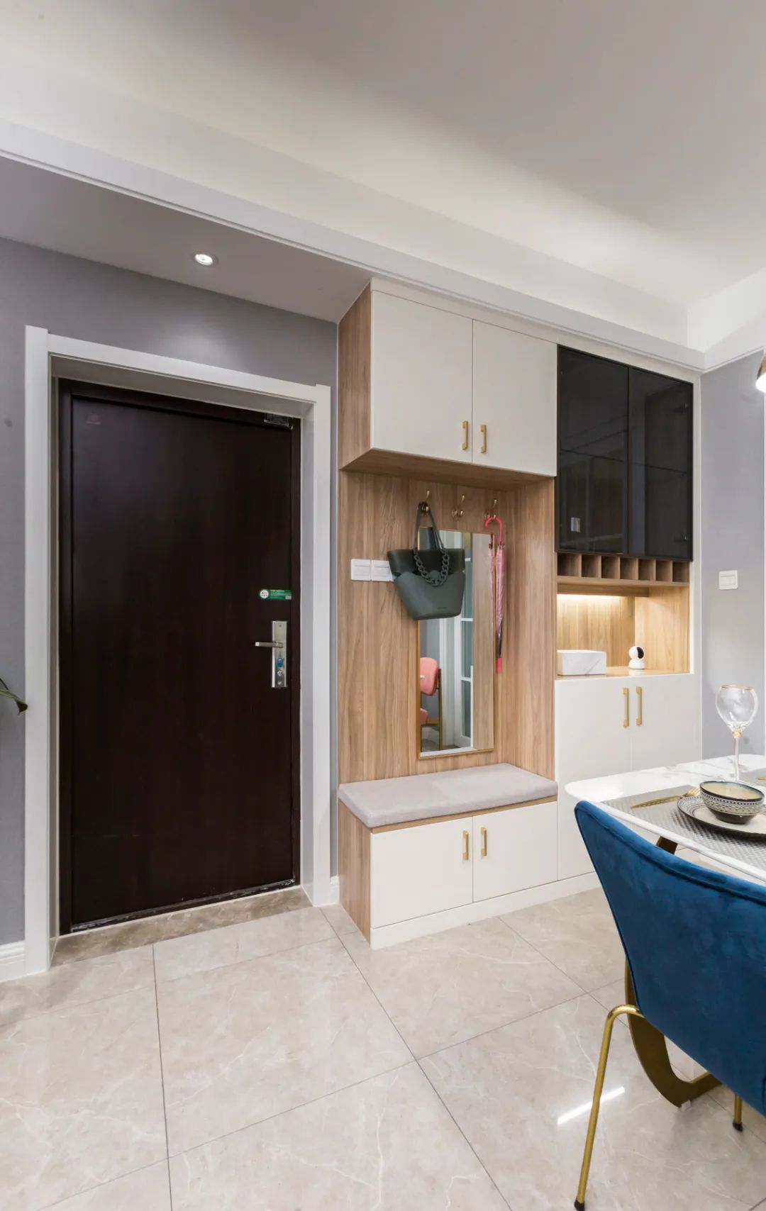 可以利用靠墙的位置定制嵌入式玄关柜,以满足入户玄关的收纳储物功能。