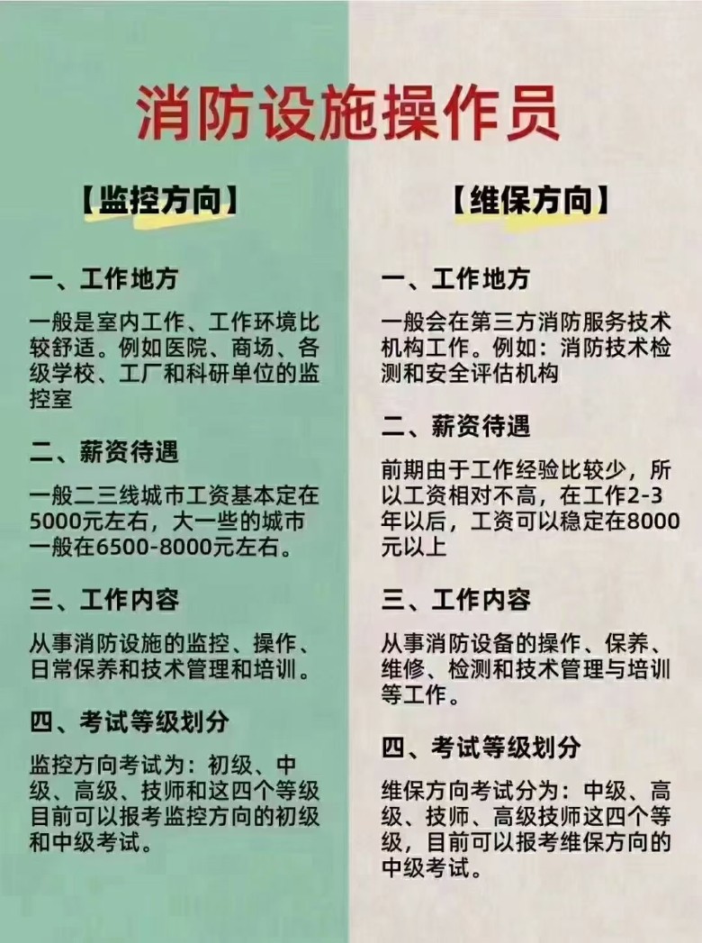 消防设施操作员属于准入类证书,于2015年正式推出,前身为中控员、建(构)筑物消防员。是指从事建(构)筑物消防设施运行、操作和维修、保养、检测等工作的人员。其工作内容包括:值守消防控制室;操作、维修保养火灾自动报警、自动灭火系统等消防设施;检测火灾自动报警器、自动灭火系统等消防设施。【报名条件】 高中及同等学历,年满24~55周岁。1. 具备以下条件之一者,可申报五级/初级工: (1)累计从事本职业或相关职业工作1年(含)以上。 (2)本职业或相关职业学徒期满。2. 具备以下条件之一者,可申报四级/中级工: (1)取得本职业或相关职业五级/初级工职业资格证书(技能等级证书)后,累计从事本职业或相关职业工作4年(含)以上。 (2)累计从事本职业或相关职业工作6年(含)以上。 (3)取得技工学校本专业或相关专业毕业证书(含尚未取得毕业证书的在校应届毕业生);或取得经评估论证、以中级技能为培养目标的中等及以上职业学校本专业或相关专业毕业证书(含尚未取得的毕业证书的在校应届毕业生)。【考试科目及作答方式】(一)考试共设《理论》和《技能》2个科目。(二)理论机考,理论单选题100道,判断题60道,多选题40道,总共200道题,每题0.5分。考试60分合格。(三)【初级实操】也是机考,20个考点,其中8个关键技能,也就是必考题52分,剩下12个随机抽考,分值48分,总分100分,60分及格。【中级实操】考试是采用考官问,你来指认和操作的方式,总共是38个考点,其中有12个考点他是属于关键技能,也就是必考题目(55分),这个是必须要掌握的题目,剩下的26个考点,会在实操中随机生成一套10-12道的考题,实操也是100分总分,60分及格。 联系人:江江老师电话:19941905958(微信同号)地址:玉山镇城北九方城市花园9栋3楼才思教育