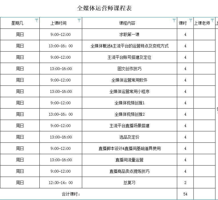 全媒体运营师考试内容考试分为理论和实操部分,满分都为100分,60分及格,理论试题题型分为单选题、多选题、判断题。考试内容包括:带货知识、内容创作、营销、直播运营、大数据分析、粉丝运营转化及流量解析、法律法规及行业趋势、产品拍摄及预热短视频拍摄、直播间的视觉呈现、直播平台规则解析、镜头表现、直播脚本撰写、直播运营基础知识、短视频账号定位、短视频内容常见问题、不同行业的内容创意、视频选题、线上运营基本操作、短视频账号常见误区等。 线下上课,地址姑苏区苏州火车站旁边。 才思教育江江老师19941905958