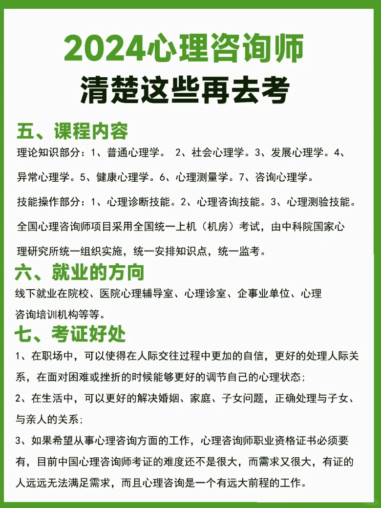 1️⃣心理咨询师证书考哪个?推荐【中科院心理咨询师】证书,中科院背书,是目前含金量最高的心理类证书,全国通用,企业认可,可以持证上岗,不限专业,专科及以上学历即可报考.2️⃣中科院-心理咨询师报考指南⭕报名条件:专科及以上(不限专业)线上学习苏州大市范围都可咨询⭕培训内容:涵盖社会心理学、人格心理学、心理健康与心理障碍等;研究心理咨询的过程、原则、技巧和方法等⭕考试形式:理论知识+专业技能,都是选择题⭕考试难度:★★☆☆☆考试难度适中,零基础备考1-3个月,合格就可以了⭕考试时间:一年两次考试,5月/11月⭕报考时间:明年3月,随报随学.3️⃣适合人群⭕对心理学感兴趣,想系统学心理学知识⭕想转行的各行各业的人士⭕想调节自己的情绪、改善人际关系、提升自己对生活的认知、改善家庭和人际交往的关系⭕自我提升,对自己的能力赋能,心理学可以和很多学科交叉,对工作和业务的开展可起到好的辅助作用.4️⃣就业方向⭕心理咨询机构:个案咨询、心理干预⭕社会组织:福利院、养老院、心理疏导⭕企事业单位:教育相关从业者、家庭教育指导师、医院相关心理科室、企业管理、婚姻情感 咨询和疏导⭕线上兼职:入驻机构或者网络平台⭕自主创业:开设个人心理咨询室.🌟持证并不等于就业,想转行的宝子可以通过考证来增加背书,学到相关的知识和技能,不要过于依赖证书,要看到考证的意义想了解证书报考可以评论区留言,或者加我微信咨询老师:江老师咨询电话:19941905958<同微信>咨询地址:昆山玉山镇九方城市花园9栋3楼——才思教育
