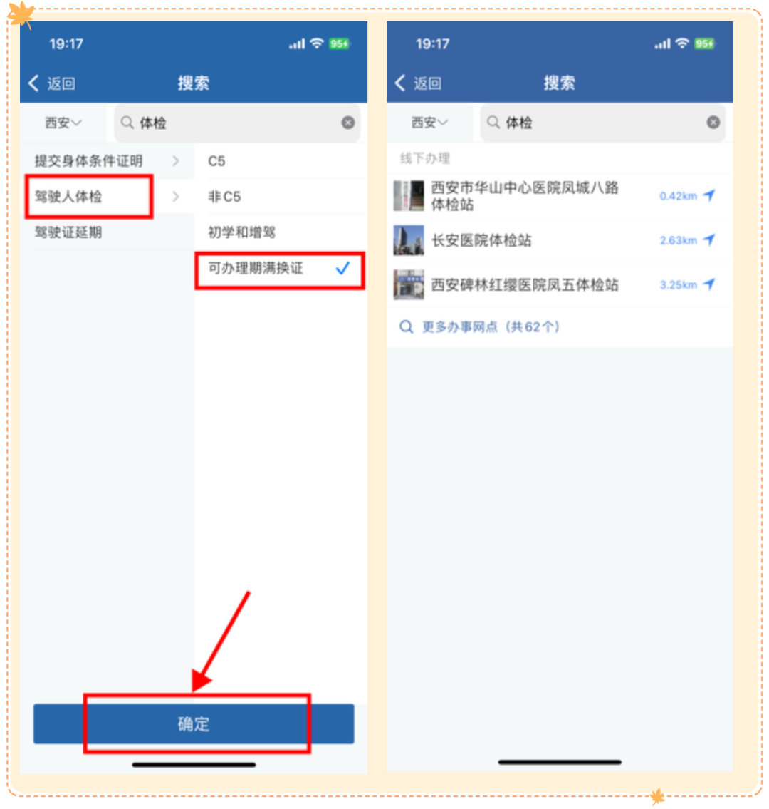 在交管12123 APP首页顶端搜索栏,搜索【体检】,点击【驾驶人体检】,再点击【可办理期满换证】,然后点击【确定】就会出来很多你附近的体检医院,选择离你最近的。