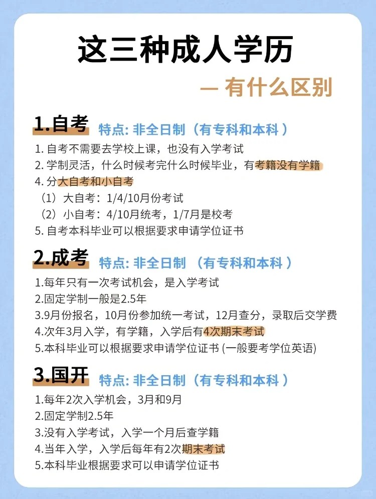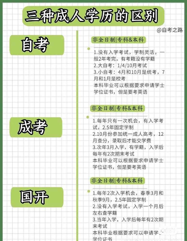 目前我们认可、学信网可查的学历有有4种:统招、自考、成人高考、国家开放大学。其中含金量zui高的就是全日制统招!除开统招其后面都是属于成人学历!大家可以看看区别在哪里。学历提升防踩雷! — ✅统招(全日制) 含金量高,是通过高三或者中专三年级参加高考后录取的是全日制。还有一种就是统招升本,全日制大专大三可以参加的一种专升本,考上后就全日制本科。全日制在社会上认可度最高! 专科3年本科4年学制! — ✅自学考试: 遵循宽进严出的原则,报考条件不受年龄、学历、居住地等限制,可异地报考。自考是单科考试的形式,及格一门颁发一门合格证书,直到所有考试科目及格后,才可以申请毕业。自考含金量高,难度大些,需要很强的自律性,不然很难毕业。适合人群:应届毕业生,或者学习能力较强有基础的人群! 大自考统考时间:4月和10月(需考14-18科左右) 小自考校考时间:6月和12月 — ✅成考(成人高考) 每年8-9月网报,9月现场审核,10月考试,11月查成绩,12月查录取,查到录取后次年3月入学 从入学起算2.5年毕业(医学类专业是3年毕业),每年只有1次报名注册的机会。 高起专:总分450分,一般考个120分左右就可以上 专升本:总分450分,一般考个130分左右就可以上线。 成考有考籍,有入学,报名需要前置学历。报本科需要大专毕业证以及学信网学历电子备案表 — ✅开放大学(国开、广开) 开放大学目前蕞简单省事的提升方式,难度低,宽进宽出。 学制:开放大学固定学制2.5年制。 每年两次,每年的3月或9月入学,免试入学,在规定期限内修满学分就可以申请毕业啦,如果没有时间自己完成教务的,还可以托管给机构辅助完成,线上配合期末考试即可,开放大学适合工作忙、没有时间线下考试的小伙伴。 — 以上就是国内目前四种提升学历的方式,大家可以看看统招、自考、成考、国开,看一看哪种更适合现在的你? 昆山才思教育 江江老师19941905958 昆山玉山镇城北紫竹路九方城市花园9栋三楼