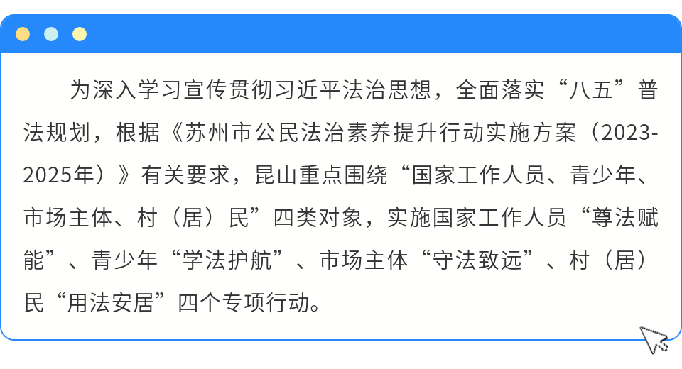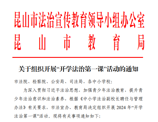 2024年春季开学,昆山市法宣办联合市教育局以“与法同行 护苗成长”为主题组织开展“开学法治第一课”活动,在全市中小学校范围内广泛宣讲有关未成年人保护法、预防未成年人犯罪法、未成年人网络安全保护条例等相关法律法规,提升青少年法治意识和法治素养。