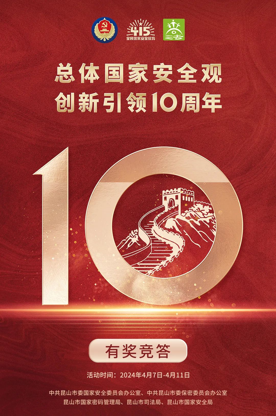 活动期间每人每天限答题1次,每次从后.台随机抽取10道题目,答对题目数量即为得分数,每次答对6题即可参与红包抽奖。活动期间累计答题积分排名前十的用户将受邀参加全市“4·15全民国家安全教育日”线下活动,同时领取丰厚奖品。(*线下活动具体时间、地点将另行电话通知。)活动期间获得的积分还将同步纳入“尚法昆山”全民学法积分平台,参与的小伙伴们还有机会赢取手机话费奖励。
