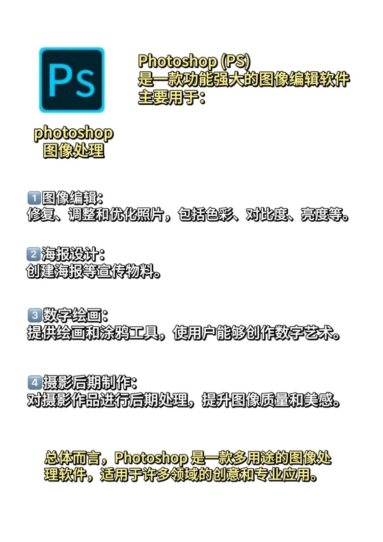 总体而言,Photoshop是一款多用途的图像处理软件,适用于许多领域的创意和专业应用。