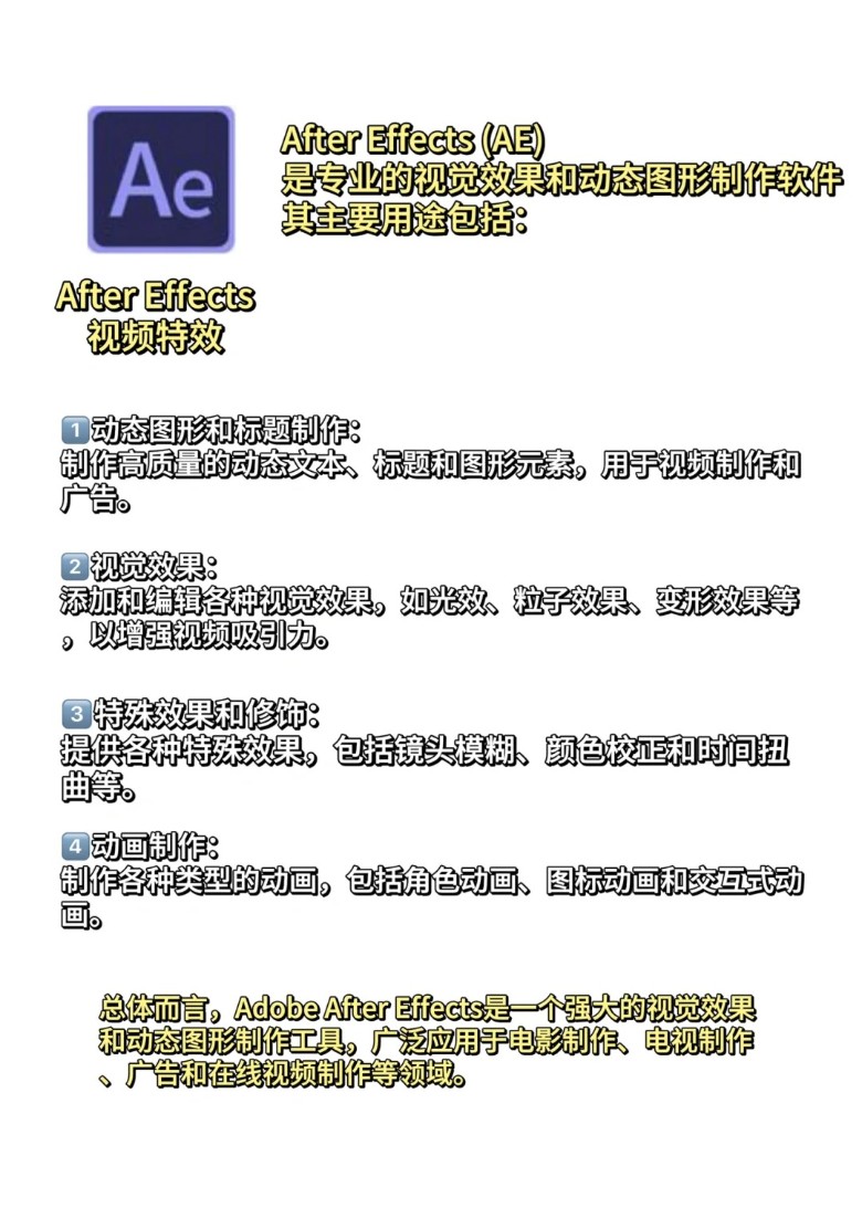 4动画制作:制作各种类型的动画,包括角色动画、图标动画和交互式动画。总体而言,AdobeAfter Effects是一个强大的视觉效果和动态图形制作工具,广泛应用于电影制作、电视制作、广告和在线视频制作等领域。