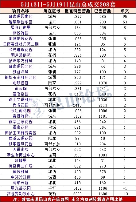 根据昆山官方网站数据显示,昆山房产网最新统计,昆山楼市5月13日-5月19日共成交208套房源。