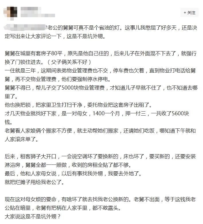 担心时间久了,外甥也被租客坑到床上去