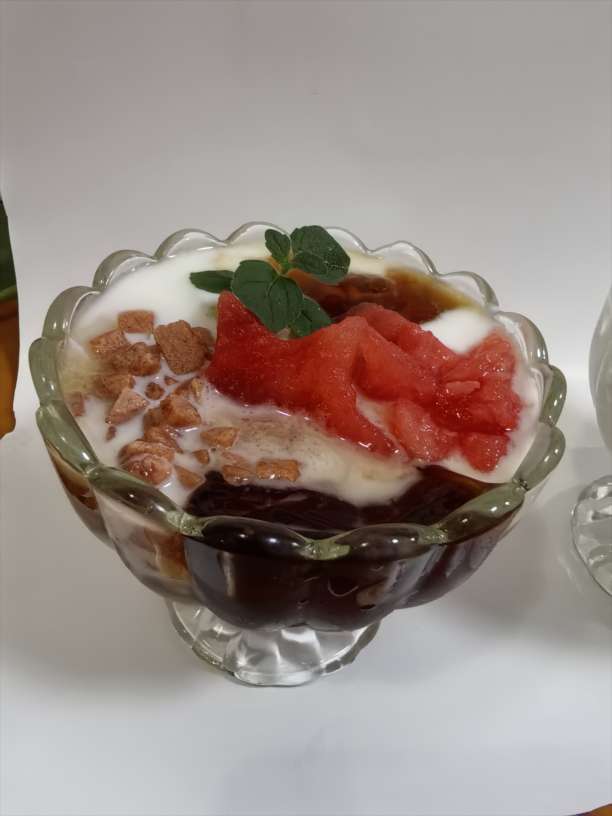 材料:白凉粉包,双皮奶,葡萄干,冰沙,装饰物,一定要有山楂,和酸奶