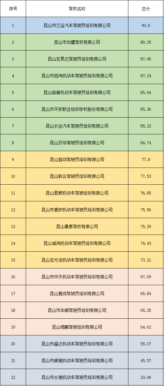 备注:昆山市旭越机动车驾驶员培训有限公司、昆山市华昆驾驶员培训有限公司因开业未满6个月,暂不参加本次考评。