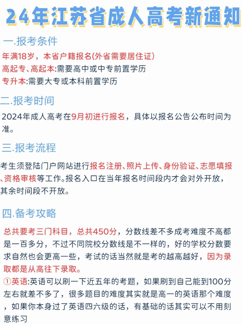 一、江苏成考报考时间 报名时间: 2024年8月底-9月初(领取免费资料开始复习)