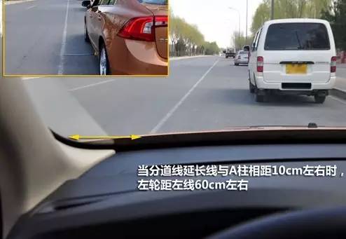 你以合适坐姿平视前方,地面分道线与车子左前角重合,并且延伸线与前挡风左下角距离10cm左右,此时车子距左车道线大约60cm左右。