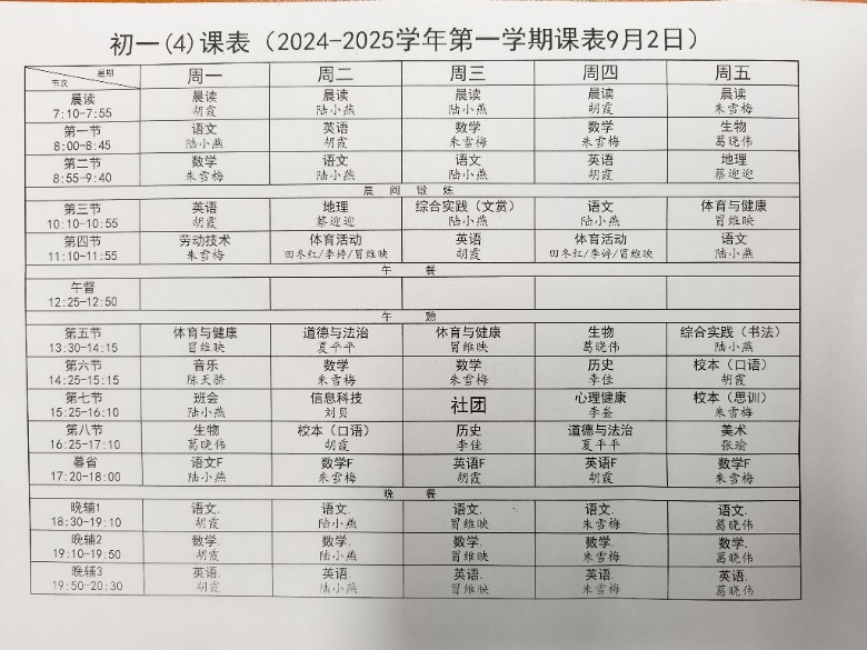 一叶一菩提:给你们看看我们南通初一的课程表(中午午休是30分钟),太累了,我都不高兴卷了,随缘[图片] (2024-09-05 10:07)