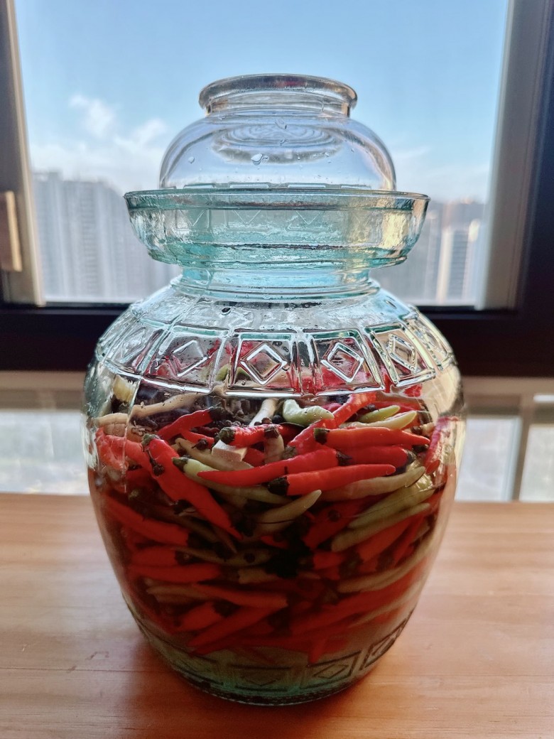 秋天丰收的季节,买了湖南这种辣椒,今天一早起来泡了一坛子。