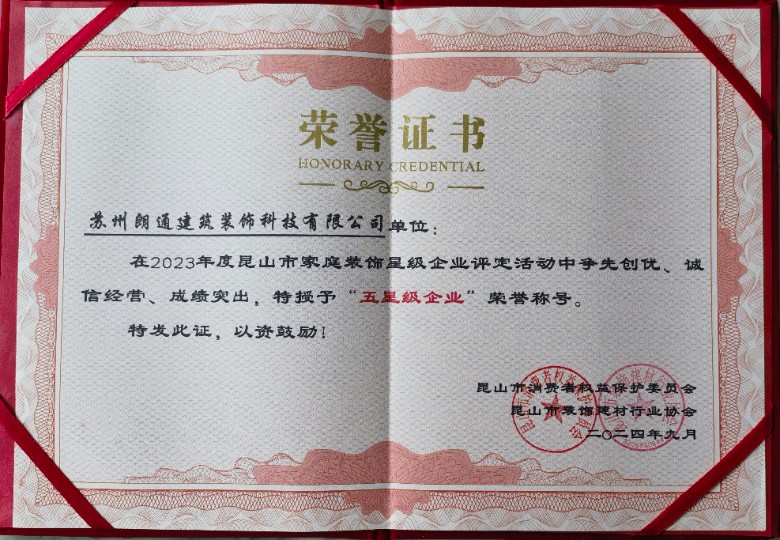 诚信是企业立身之本,是企业无形资产的核心,也是企业市场经营的“通行证”。我司经昆山信用办、 消保委及装饰协会评选,被评为“五星级企业”。朗通装饰自2006年成立以来一贯坚持合法经营,公平竞争,自创信誉,从而提高企业核心竞争力。 朗通装饰连续多年荣获“五星级企业”。感谢昆山信用办 消保委及装饰协会领导对我们朗通装饰的认可,朗通定会为行业树立良好示范,为广大消费群体提供更加优质的消费体验,切实维护消费者的合法权益,为社会诚信建设添砖加瓦。