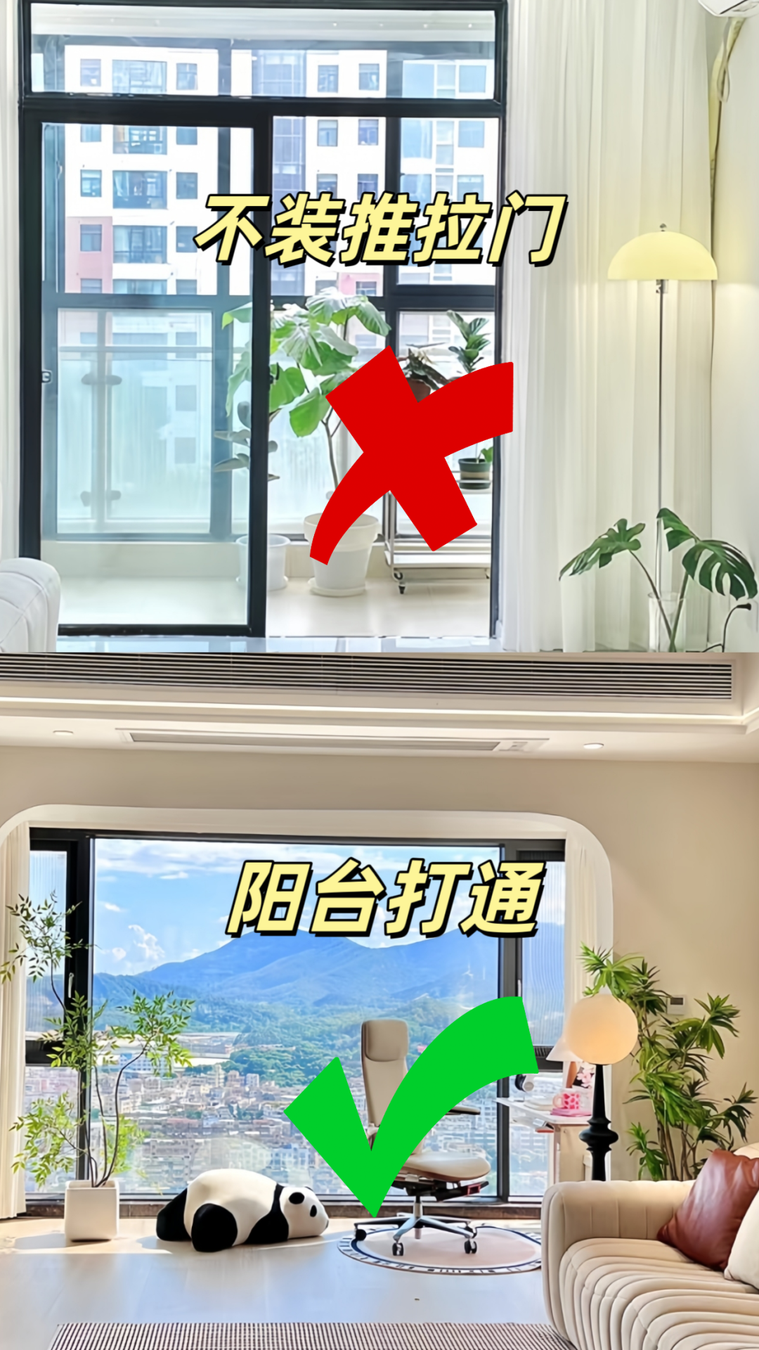 阳台装推拉门,不仅影响采光,而且视觉上显得整体空间狭小,不大气。将客厅与阳台打通形成一体,不仅能增加空间的通透性,整个客厅看起来也显得更大气更美观。