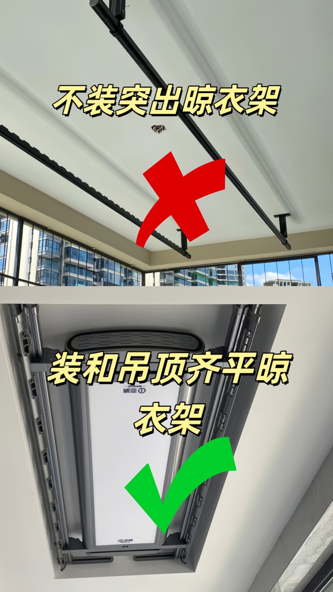 传统突出的晾衣架虽然使用方便,但影响阳台的美观。安装和吊顶齐平的晾衣架,能让阳台看起来更加整洁、美观。