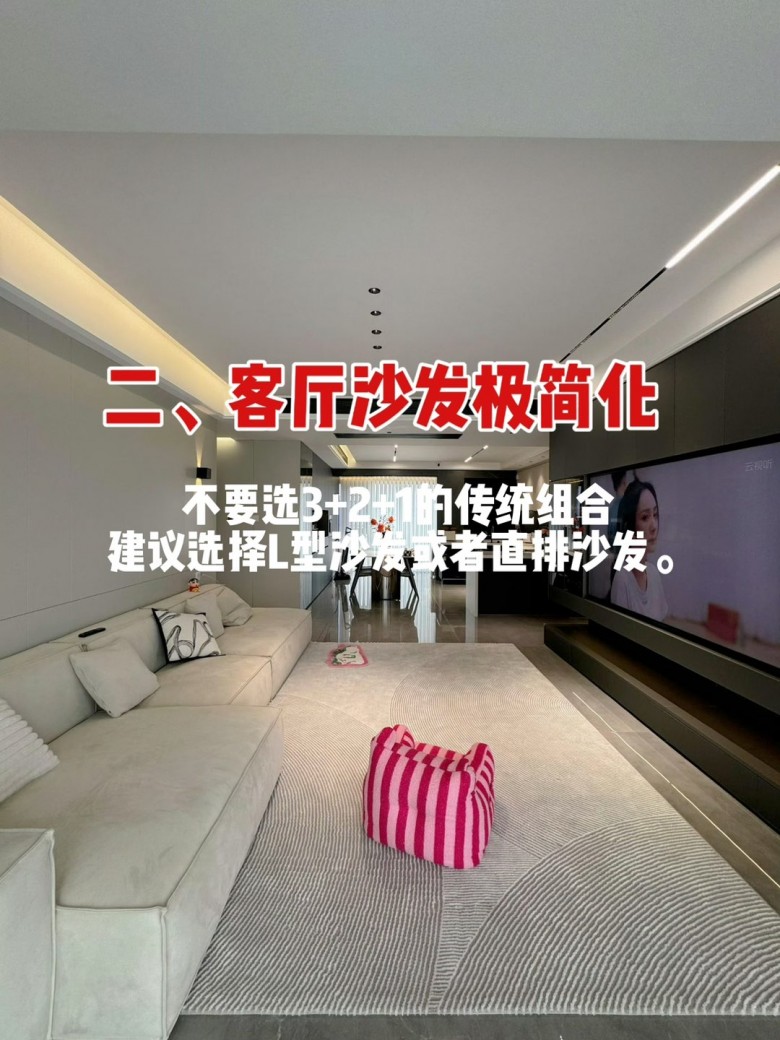 2、客厅沙发极简化,不要选3+2+1的传统组合,建议选择L型沙发或者直排沙发。
