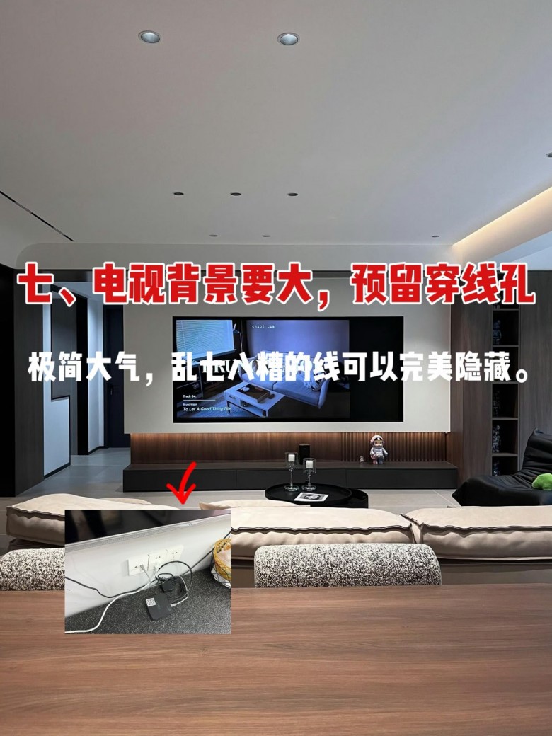 7、电视柜背景要大,预留穿孔线,这样做极简大气,乱七八糟的线可以完美隐藏。