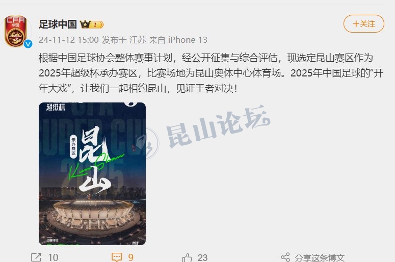 根据中国足球协会整体赛事计划,经公开征集与综合评估,现选定昆山赛区作为2025年超级杯承办赛区,比赛场地为昆山奥体中心体育场。2025年中国足球的“开年大戏”,让我们一起相约昆山,见证王者对决! F,Y,0f@4U9