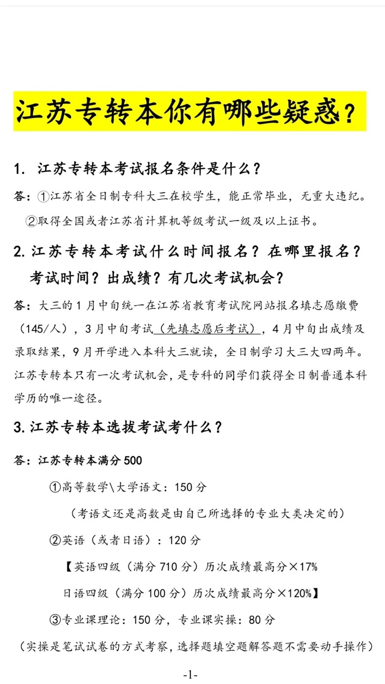 2.江苏专转本考试什么时间报名?在哪里报名? 考试时间?出成绩?有几次考试机会?答:大三的1月中旬统一在江苏省救育考试院网站报名填志原费(145/人),3月中旬考试(先填志展后考议),4月中旬出成绩及录取站果,9月开学进入本科大三就读,全日制学**三*四两年。江苏专转本只有--次考该机会,是专料的问学们获得全日制普通本科学历的唯一途径。