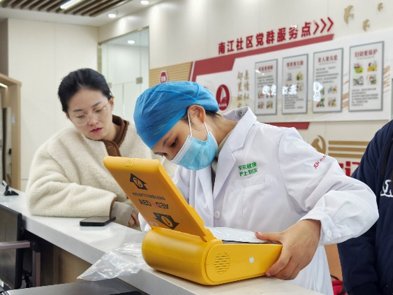 相关数据显示,在我国,每年约有55万人发生心源性猝死。心源性猝死发病急、进展快、病情凶险,而且80%的病例发生在医院外,抢救困难,死亡率高。可由于急救设备和急救意识的缺乏,抢救成功率不到2%。在患者突然发病时,AED可以自动诊断,并且给予电击除颤,帮助恢复心律,同时配合心肺复苏,在专业医务人员到来前为患者争取救治时间。AED操作简单,当突发情况发生,首先拨打120,同时用最快的速度打开AED,按照机器的操作提示对患者进行急救。AED能够自动分析患者心率,施救者根据语音提示即可操作,在第一时间展开救护。”