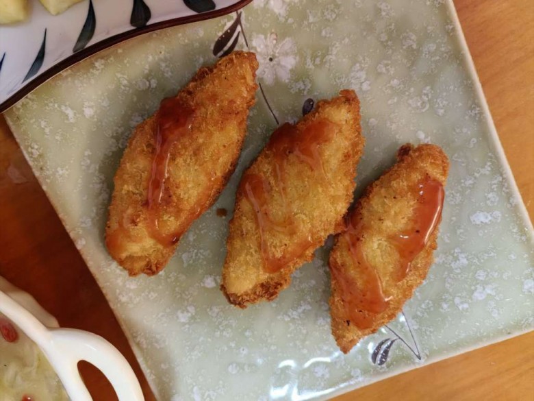1、【香煎/炸鱼排】冰箱里就剩三块了,直接煎了煎(其实也可以说是炸,但油也没放太多)总之是双面煎黄,挤点西红柿汁,即完成。