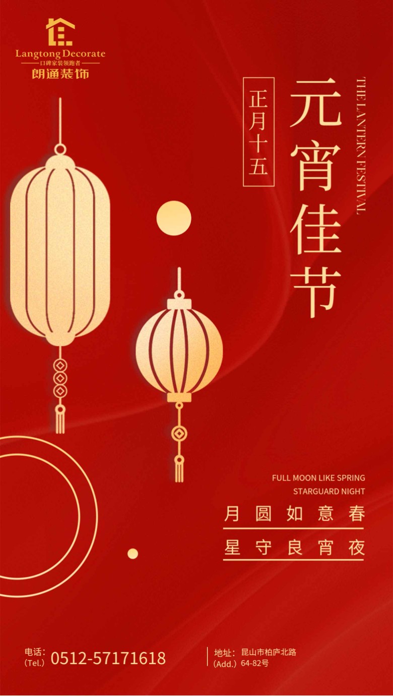 元宵佳节,月圆人团圆!愿您的生活如我们精心打造的装修一样,温馨美满,幸福常伴!祝您元宵节快乐,阖家幸福!