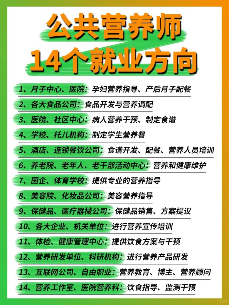 随着大家对健康越来越重视,现在公共营养师就业岗位还是挺多的,下面罗列了公共营养师常见的14个就业方向: