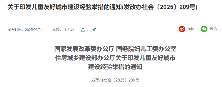 近日,国家发展改革委办公厅、国务院妇儿工委办公室、住房城乡建设部办公厅联合印发通知,发布儿童友好城市建设经验举措清单。
