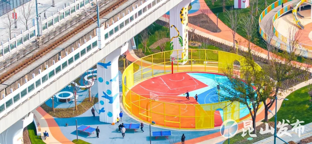 花桥缤纷运动乐园原先是一片闲置绿地,被纳入“昆小薇”项目后,通过精心打造动物主题儿童友好空间,小昆现场看到高大的轨交立柱上,熊猫、狐狸、长颈鹿等动物卡通形象生动活泼,小朋友们在滑滑梯、秋千、环形步道等各类玩乐设施上玩耍,原本冷冰冰的桥下空间“摇身”成为充满童趣的儿童运动乐园。