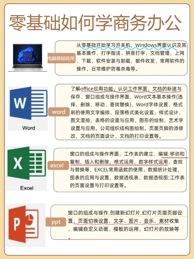 学习内容包含了办公三大软件!Excel(表格制作、数据处理、数据分析、图表设计、函数计算、美化图表、排列组合等)适用对象:文员、人事、行政、财务、出纳、仓管Word:( 简历、合同、标书、管理制度、员工手册、工作流程、策划书、项目书等)适用对象:文员、人事、行政、办公室、秘书、助理PPT(工作汇报、工作总结、年中汇报、培训、演讲)适用对象:人事、行政、高管、管理、老板)