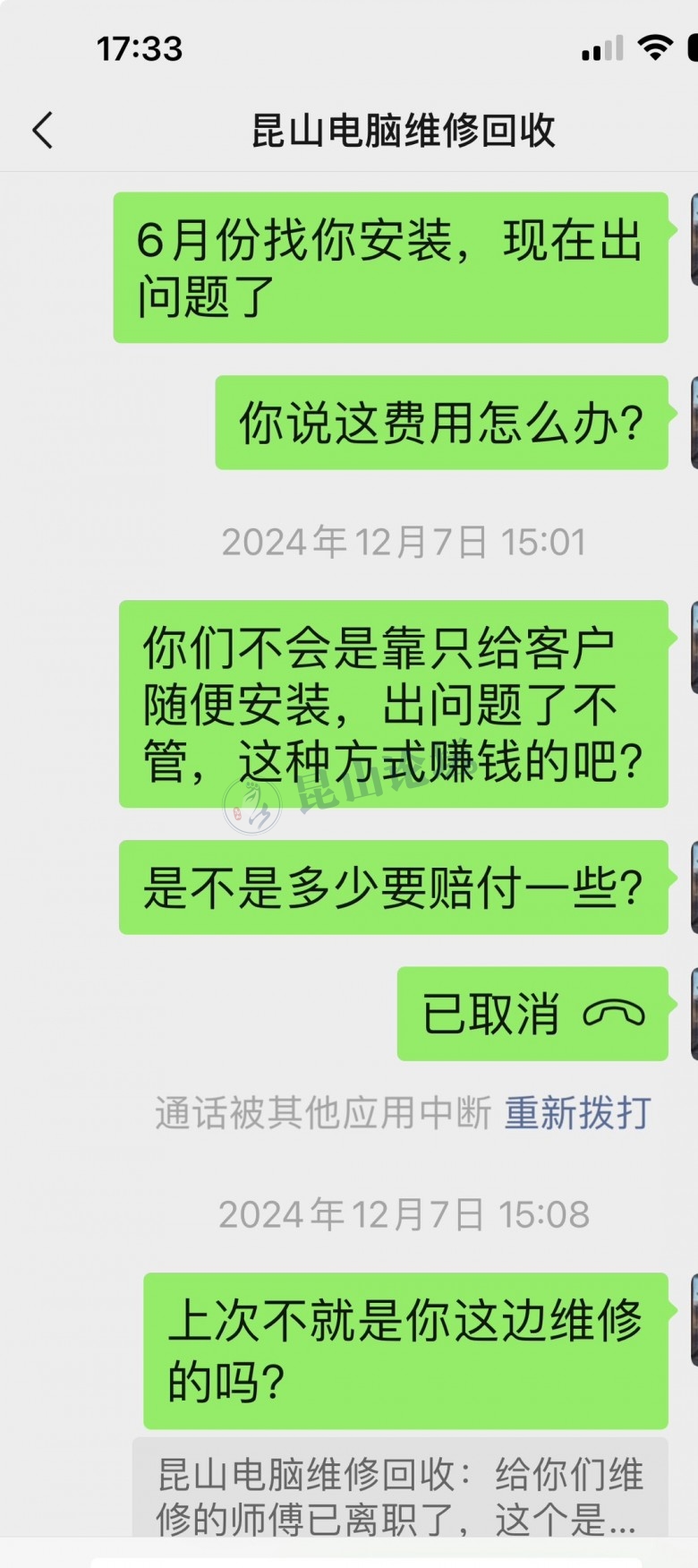 结果到了2024年12月的时候,电脑又出问题了,再在微信上联系他的时候,他就一句“给你们维修的师傅已离职了”的借口为由,拒绝承担一切售后维修服务。
