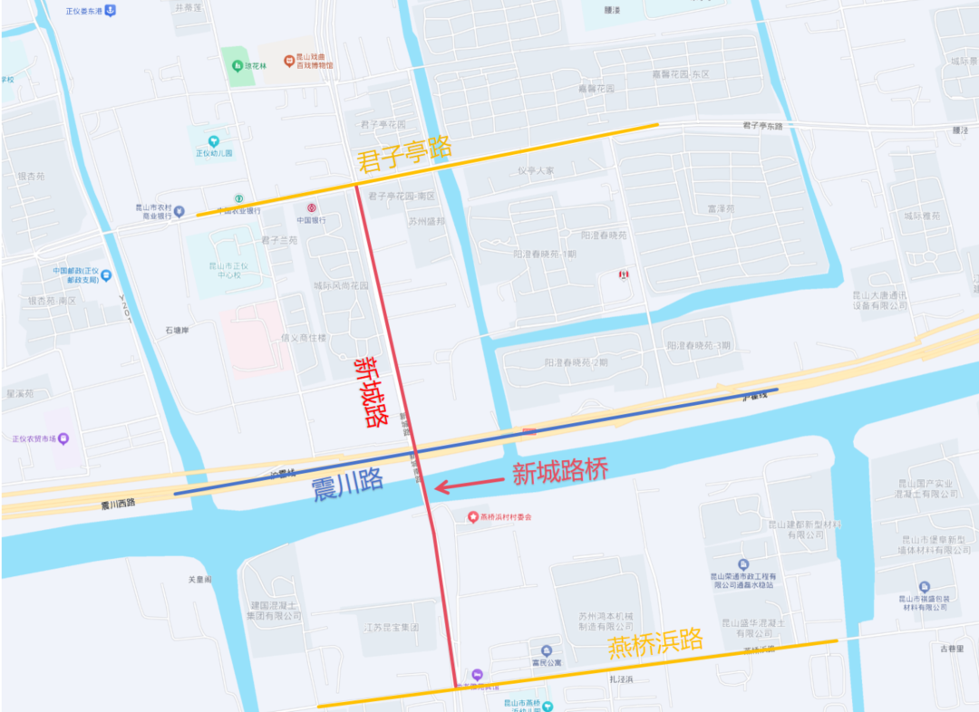 新城路桥是巴城正仪连接高新区的重要南北向通道。新城路改造项目将在老桥西侧新建一座新城路大桥。新城路大桥跨越娄江和震川西路,引桥北接君子亭路,南接燕桥浜路,建成后可有效改善周边交通出行条件。