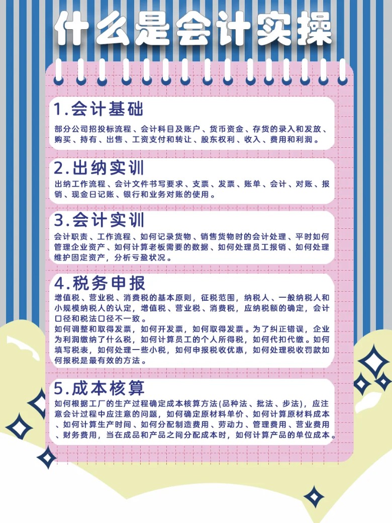 2️⃣ 出纳实训:涉及现金管理、银行结算、**的填写与保管等实际操作,掌握出纳工作的基本流程和规范。