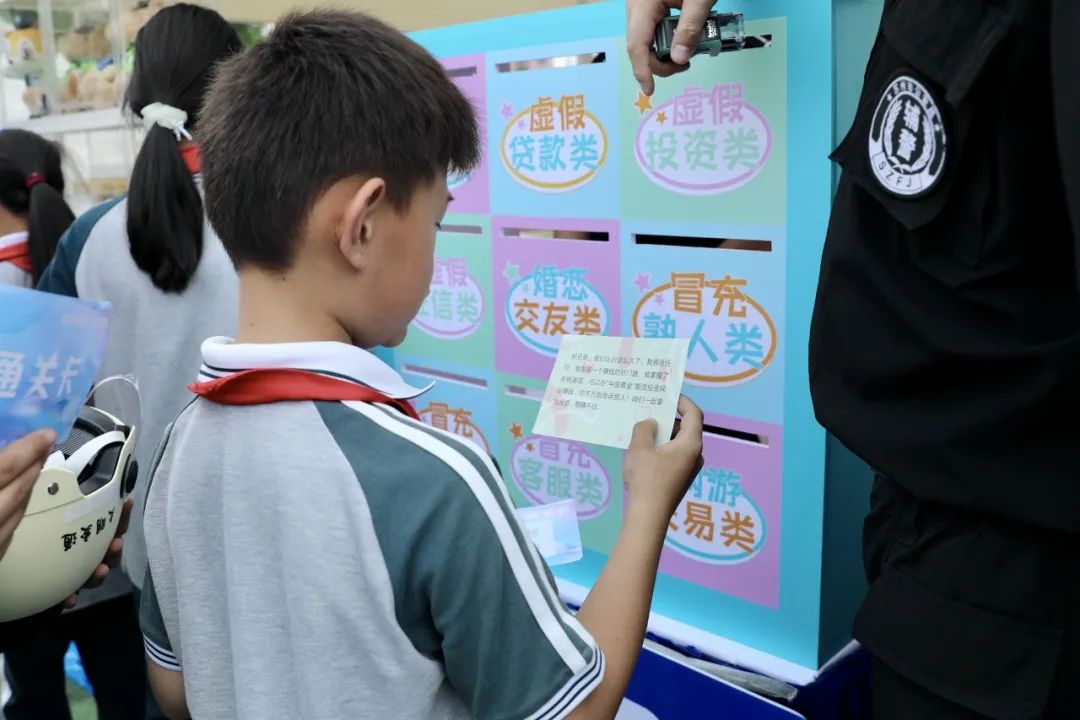 “我会回家跟爸爸妈妈说,聊天群里‘老师’要求家长扫码预缴学费,这种情况通常是诈骗,一定要跟老师电话核实。” 少年警校的小警员举着通关卡片说道。