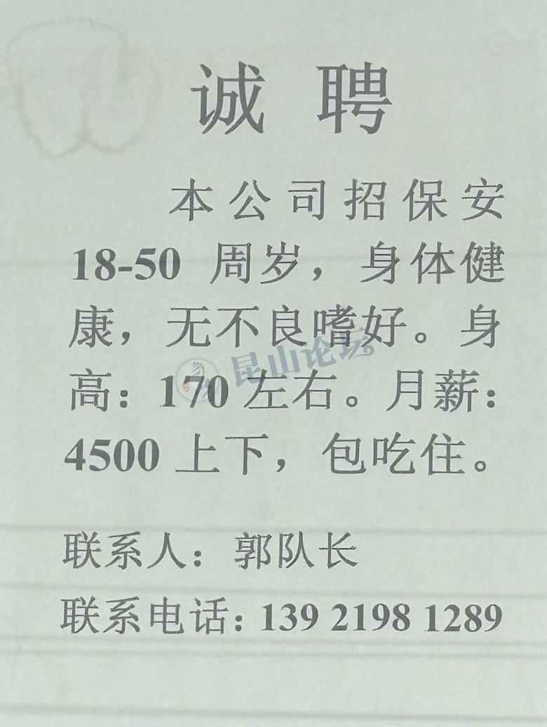 城北招一名保安长白班,年龄18-35,工资4500以上
