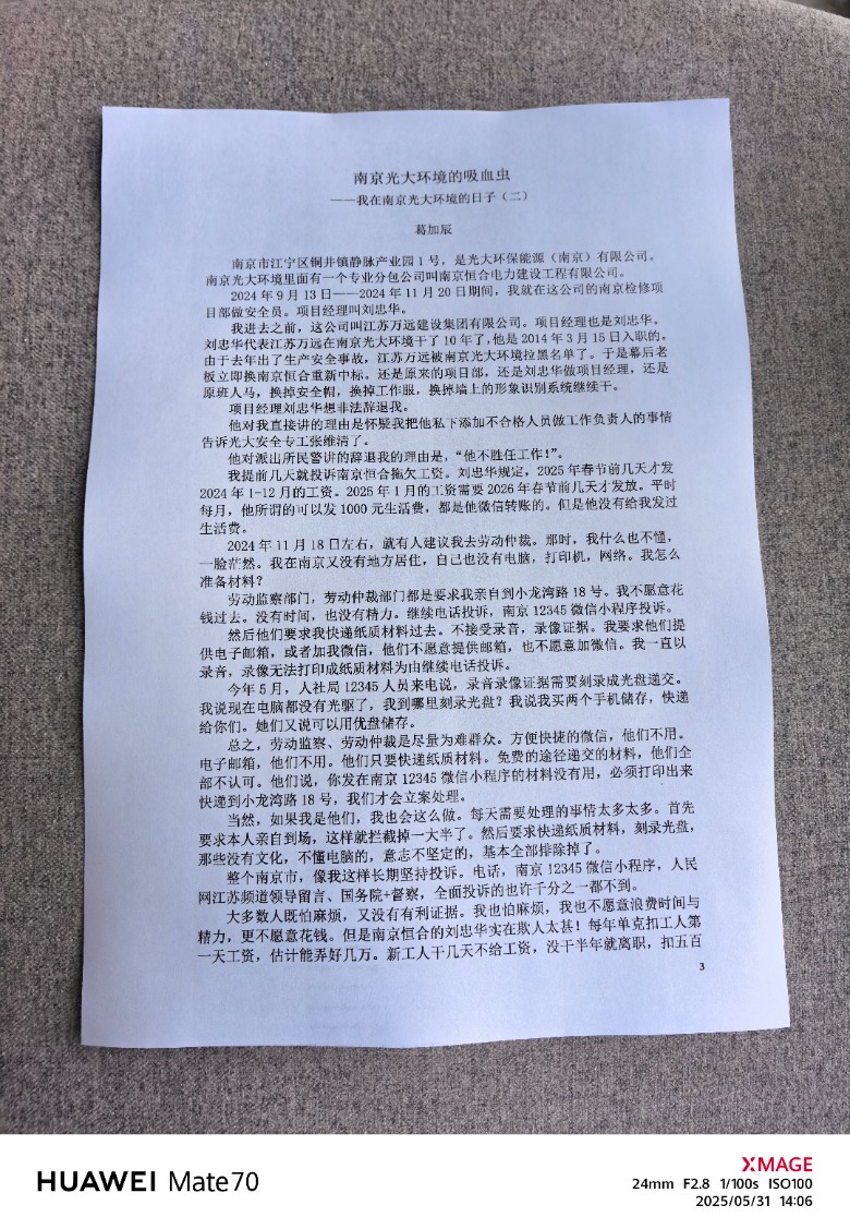 没地方投诉。我们属于南京光大环境。他们公号只宣传正面消息。总经理去年组织舆论引导小组,专门对付我。