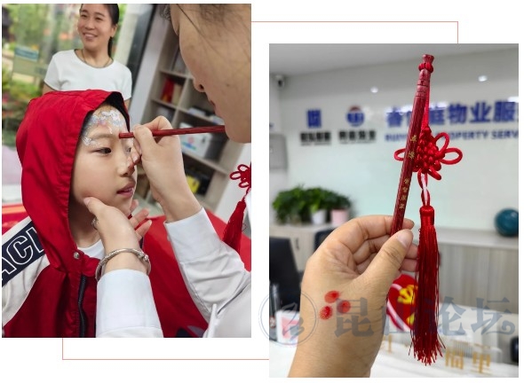 儿童额头点朱砂环节,充满了浓浓的传统文化气息。物业客服人员用专业朱砂笔蘸取朱砂,在孩子们的额头轻轻点上红点,寓意着开启智慧、辟邪祈福。孩子们整齐有序地排队,眼神中满是好奇与期待。点完朱砂后,孩子们个个神采奕奕,宛如灵动的小天使,家长们纷纷拿出手机记录下这珍贵的瞬间,现场温馨又欢乐,传统文化的种子也在他们心中悄然种下。